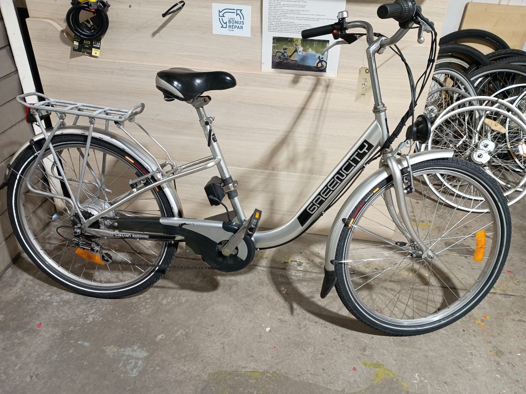 1510 VAE 26″ gris GREENCITY : 6 vitesses, batterie neuve, garde-boue, porte bagage, lumières, béquille, sonnette