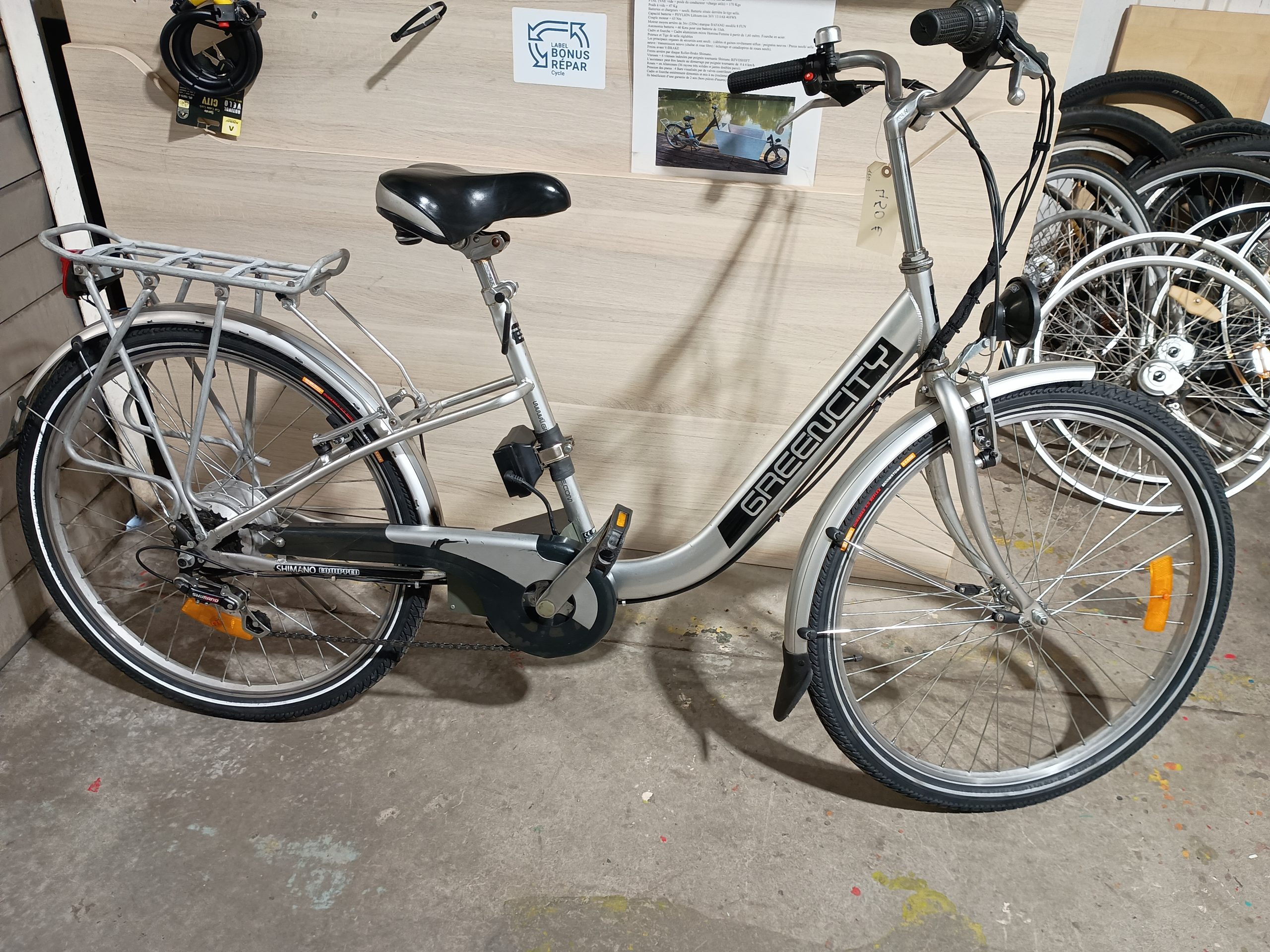 1510 VAE 26″ gris GREENCITY : 6 vitesses, batterie neuve, garde-boue, porte bagage, lumières, béquille, sonnette